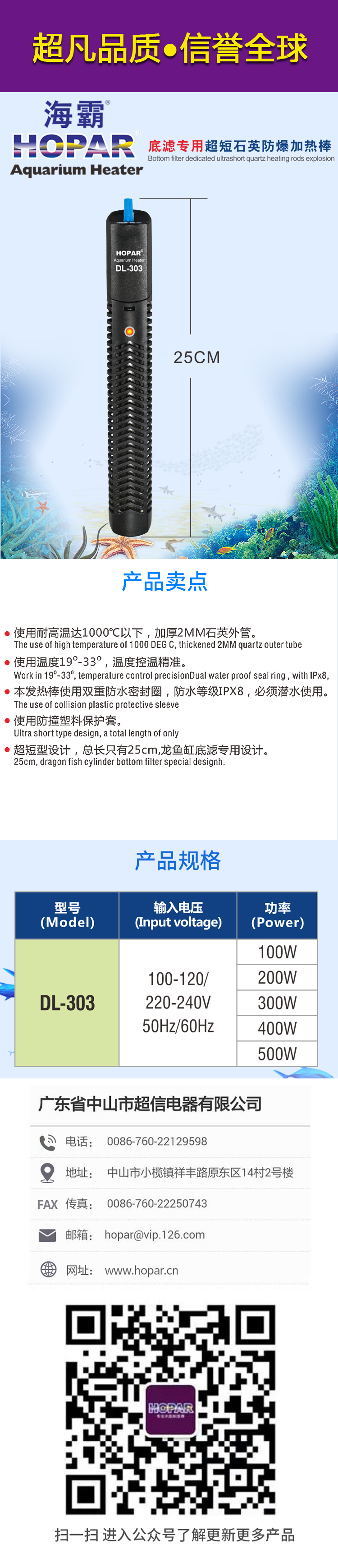 HOPAR海霸 DL-303 底滤专用超短石英防爆加热棒